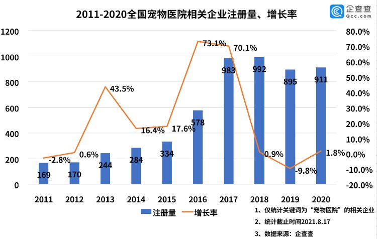 2020年中国宠物医疗行业白皮书显示,到2020年,我国宠物家庭将达到9980万,其中60%以上的宠物有就医经历。在巨大的市场规模和消费需求下,商家争相加入宠物医疗服务。企业数据显示,近十年来(2011-2020年),全国宠物医院相关企业注册增速达到439%,宠物医疗市场规模高达400亿元。仅山东省就有521家注册宠物医院。